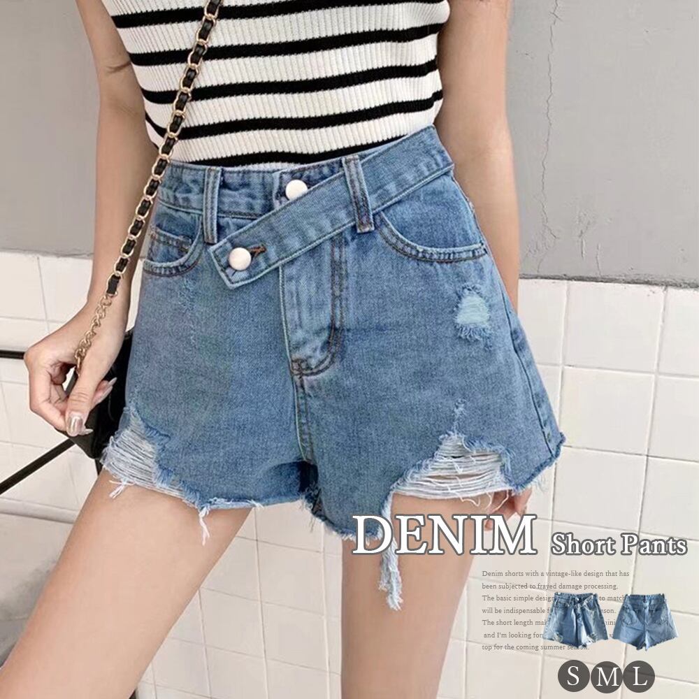 ダメージジーンズ ハイウエスト ホットパンツ カットオフ ボトムス 無地 ワイドパンツ ヴィンテージ デニム 短パン